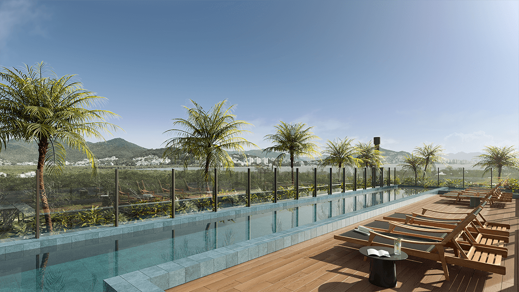 As áreas comuns de lazer foram cuidadosamente planejadas para contemplar a paisagem, permitindo que cada momento de descanso seja vivido em contato com a beleza natural que envolve o empreendimento.